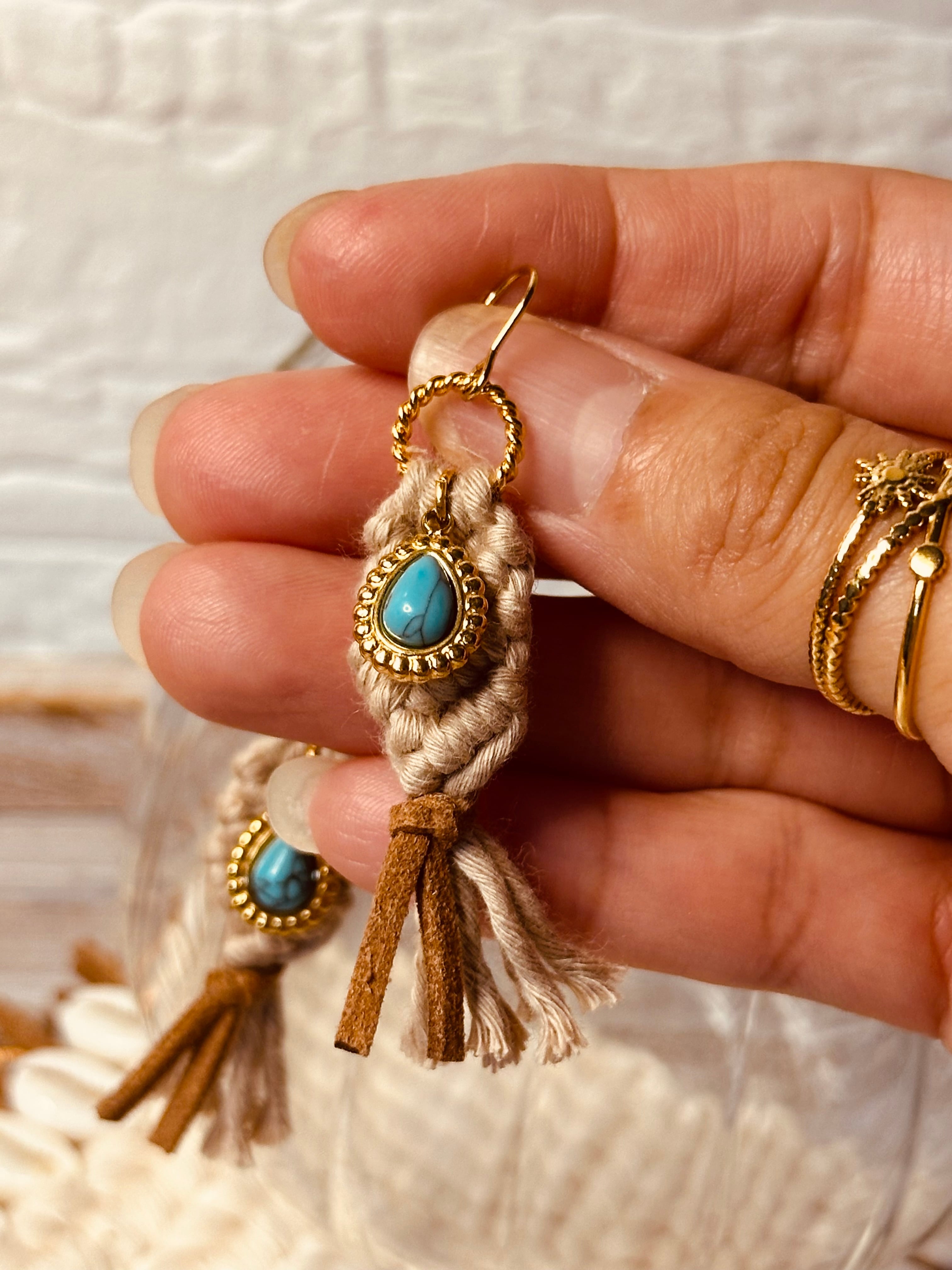 ターコイズ×スエード マクラメピアス グレージュ ✲ ナチュラルボヘミアンスタイル